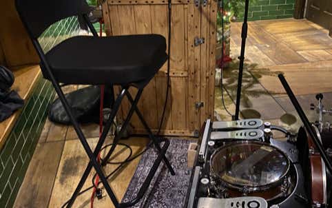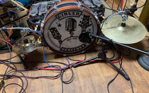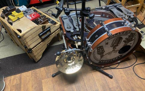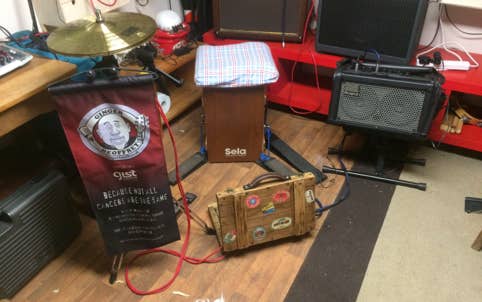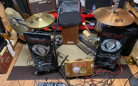 The use of the cajon became a regular thing and evolved with Ginger building a custom cajon with three bass drum pedals mounted inside the cajon. The first gave the bass drum sound, the second, from a small snare mounted inside was the snare sound and the third pedal controlled a cabasa. Ginger soon aded a hi-hat and then later a splash and crash, vibra-slap, tambourine and various shakers.