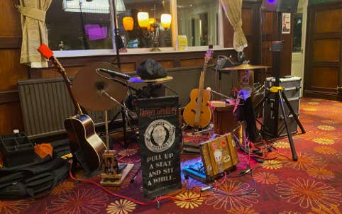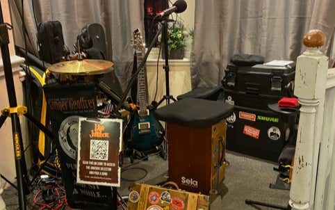 Gingers first foray as a solo performer included a crude setup with a Cajon (box drum) and bass pedal used to provide a basic rhythm. Keeping the performance 100% live with no looping was and still is his signature bare bones approach.