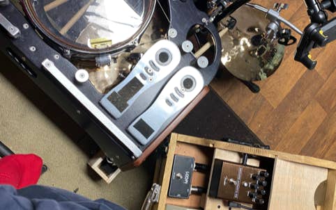 The use of the cajon became a regular thing and evolved with Ginger building a custom cajon with three bass drum pedals mounted inside the cajon. The first gave the bass drum sound, the second, from a small snare mounted inside was the snare sound and the third pedal controlled a cabasa. Ginger soon aded a hi-hat and then later a splash and crash, vibra-slap, tambourine and various shakers.